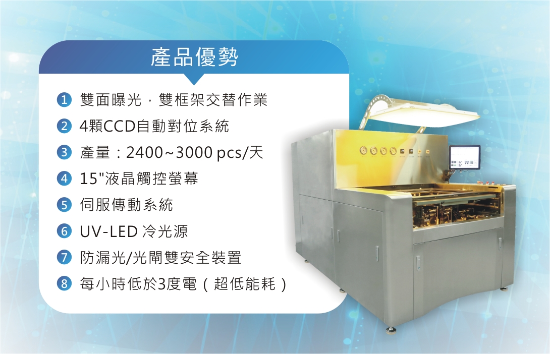 SG-3097S 半自動 首頁 產品介紹 【內層系列】 SG-3097S 半自動 產品規格: 高解析:65/65um(濕膜8~12um) 板材尺寸:305*305mm~622*724mm 板材厚度:0.1~2.0mm 產品優勢